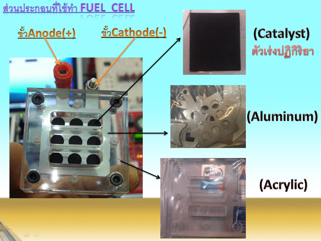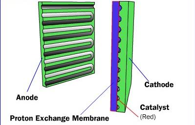 4. ตัวเร่งปฏิกิริยา (Catalyst) เป็นวัสดุพิเศษที่ช่วยให้ปฏิกิริยาในขั้นตอนต่างๆเกิดได้ดี โดยส่วนใหญ่จะเป็นผงแพลทินัมเคลือบอยู่บนเยื่อแลกเปลี่ยนโปรตอน ซึ่งจะมีลักษณะขรุขระเพื่อเพิ่มพื้นที่ผิวในการสัมผัสกับก๊าซไฮโดรเจน และ ออกซิเจน